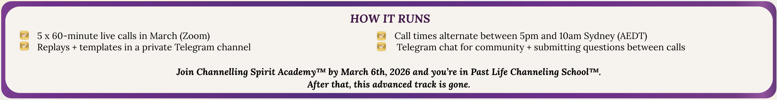A 5-week live advanced training to channel previous lifetimes for clarity, healing and soul gift activation, for yourself and, if you choose, your clients.